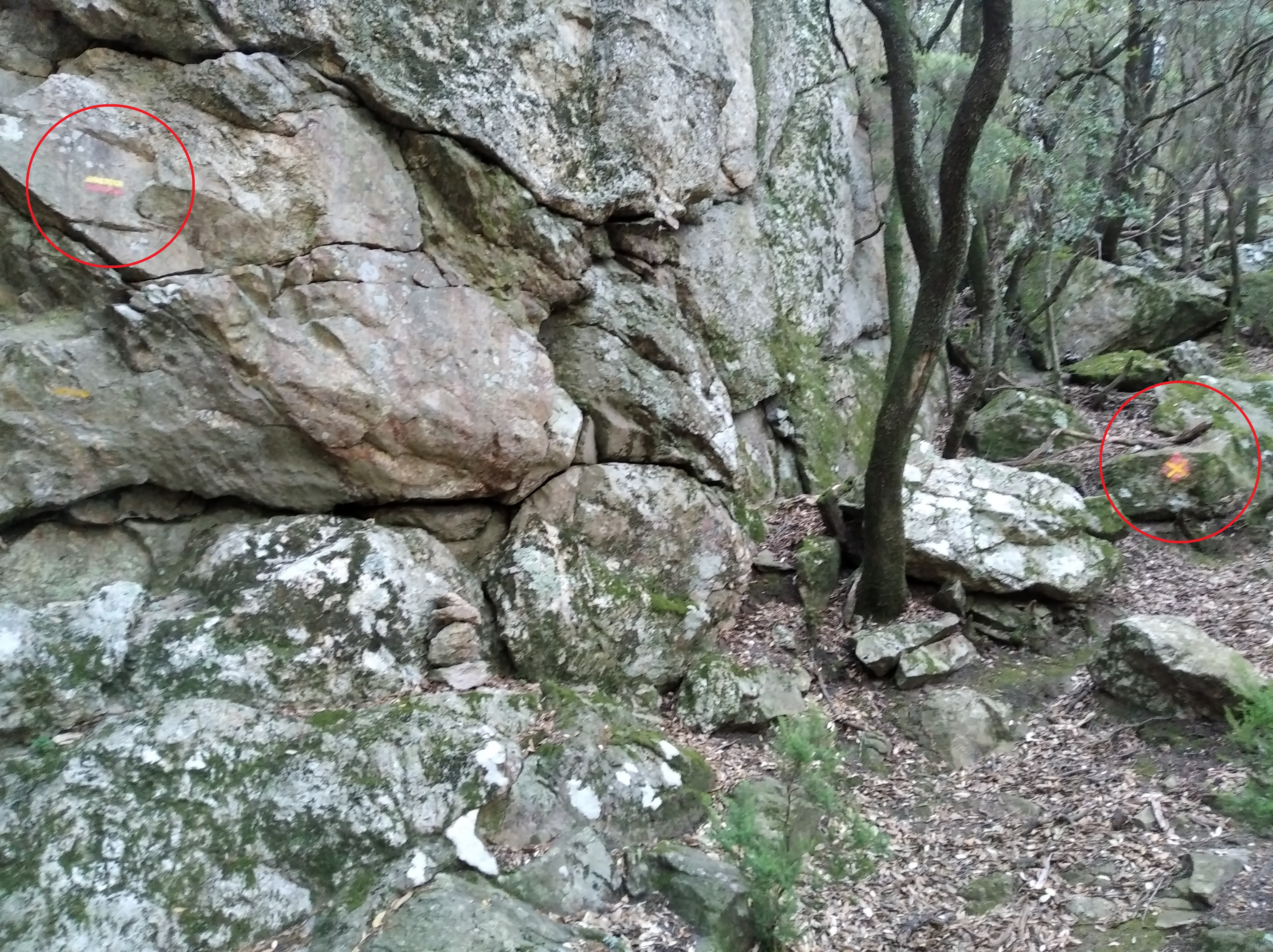 Le pied de la voie se situe à 20m du sentier des gardes, lorsque celui-ci, après avoir effectué une série de petites épingles à cheveux, se dirige presque à plat vers le nord. Lorsque vous êtes à l'endroit où a été prise la photo ci-dessous, vous y êtes!